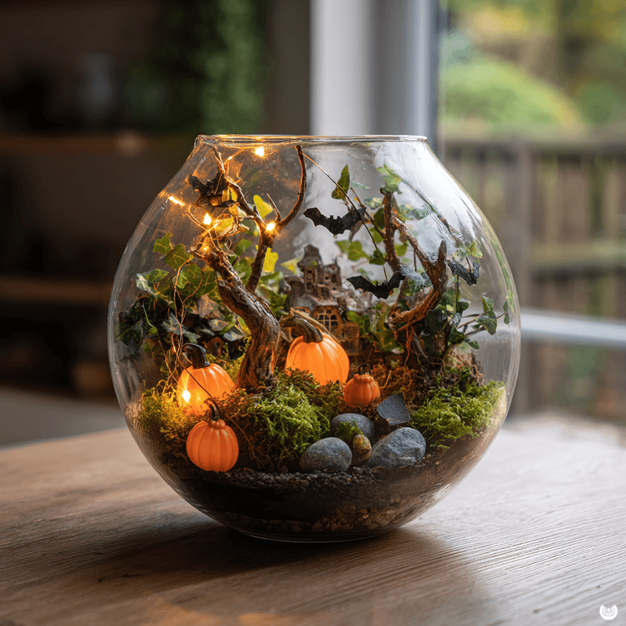 Nawiedzone terrarium, czyli Halloweenowy klimat zamknięty w szklanej kuli. Żywe rośliny i … nieżywe dodatki.
