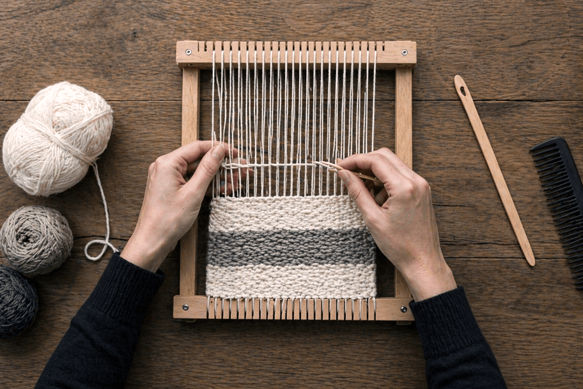 Tworzenie tkanin lub gobelinów na małych krosnach. Rytmiczna praca, którą każdy może opanować. Efekt jest teksturalny, ciepły i absolutnie wyjątkowy.